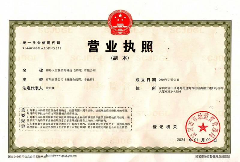 做为我国独一具有空间坐航天员产物研发、出产、发卖停业执照的大型太空食物企业集团,神舟太空食物高科技(深圳)无限公司承担着主要的。它不只是中国航天员核心高科技平易近用产物的我平易近融合项目标施行者,还肩负着我国太空高科技系列食物项目标研发、出产及财产化推广的沉担。