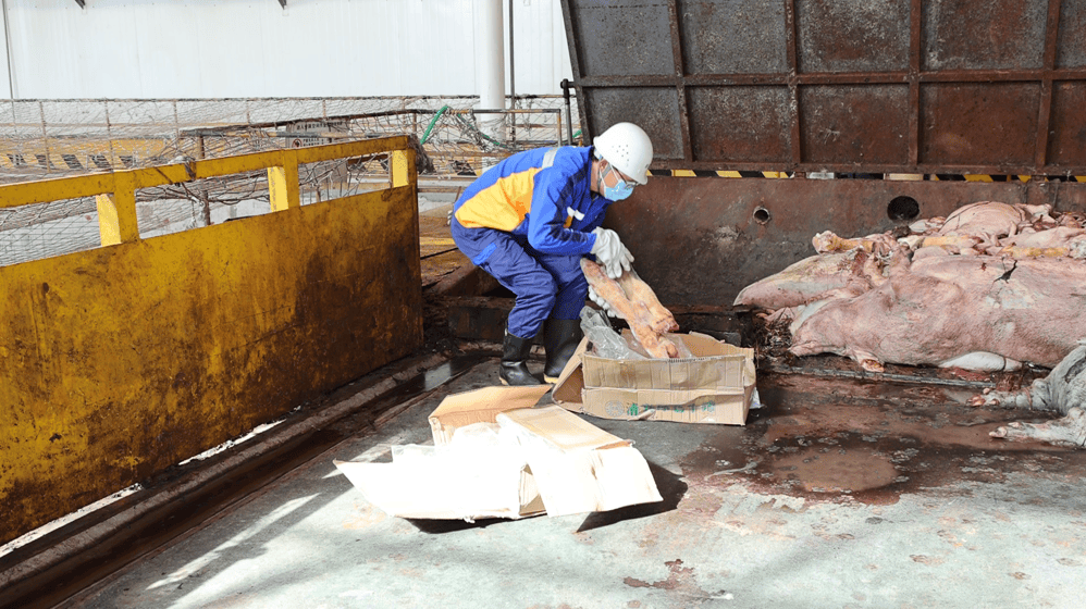 为确保工做规范、环保,法律人员将冻肉从冷库卸车后,拖至永州南部动物无害化处置核心。对冻肉进行了称沉、查抄、卸货。卸货完毕后,还对运输车辆进行了清洗,防止残留的问题冻肉形成二次污染。随后,相关工做人员对冻肉进行拆包后,将其投入火场进行无害化。